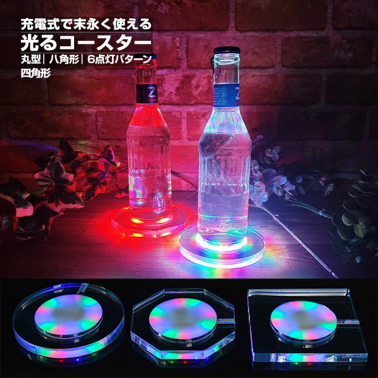 光るコースター 充電式 ライトアップ コースター ライトコースター LEDコースター 光る コップ敷き コップ受け グラスマット 丸型 八角形 四角形 RGB パターン 点灯 USB充電 タッチ式 クラブ バー イベント パーティーグッズ 誕生日 きれい おしゃれ かわいい
