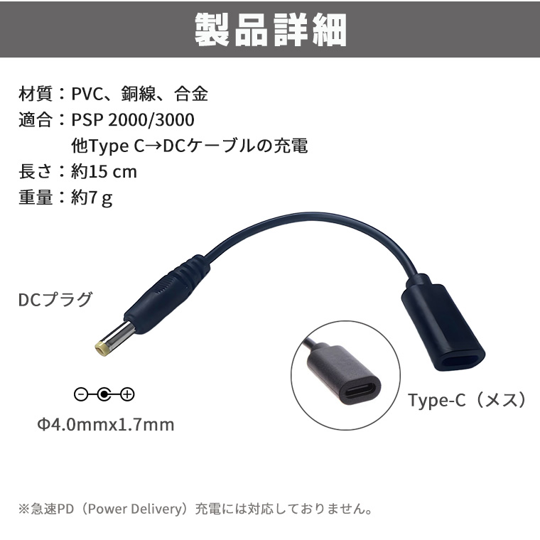 USB Type-C変換充電ケーブル PSP2000/3000 対応 USB充電ケーブル DCプラグ 4.0mm/1.75mm Type-c 充電コード 充電アダプター ゲーム機 充電 変換