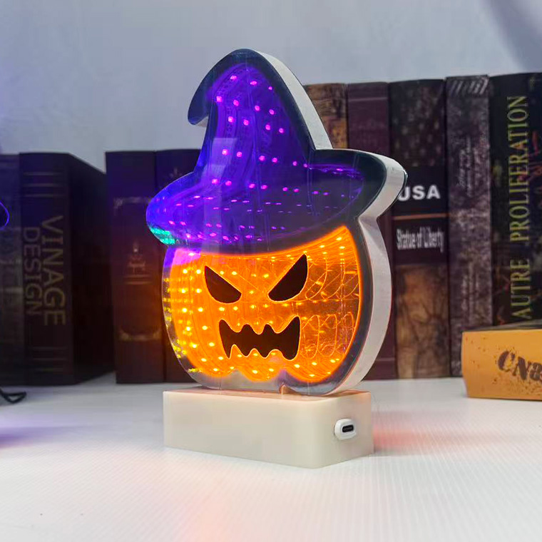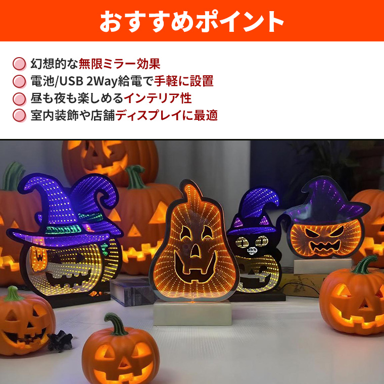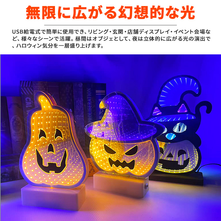 ハロウィン LED 無限 ミラーライト (インフィニティミラーランプ) トンネルランプ 2way給電 ハロウィン ライト ハロウィン飾り 電飾 USB式 電池式 インテリア サイン 看板 オブジェ 黒猫 カボチャ パンプキン 魔女