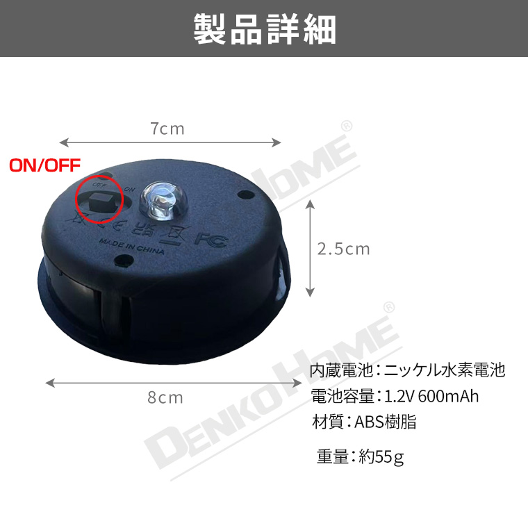 光センサーを内蔵しており、暗くなると自動で点灯、明るくなると自動で消灯。