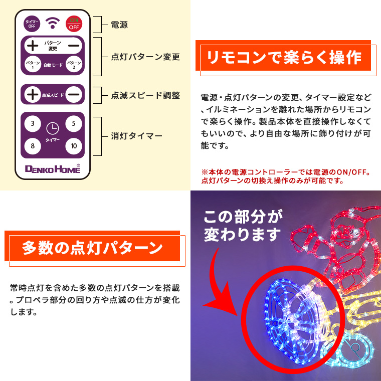 - リモコンで楽らく操作。電源・点灯パターンの変更、タイマー設定など、イルミネーションを離れた場所からリモコンで楽らく操作。製品本体を直接操作しなくてもいいので、より自由な場所に飾り付けが可能です。※本体の電源コントローラーでは電源のON/OFF。点灯パターンの切換え操作のみが可能です。