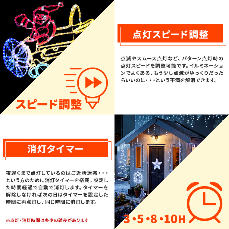 - 点灯スピード調整。点滅やスムース点灯など、パターン点灯時の点灯スピードを調整可能です。イルミネーションでよくある、もう少し点滅がゆっくりだったらいいのに・・・という不満を解消できます。