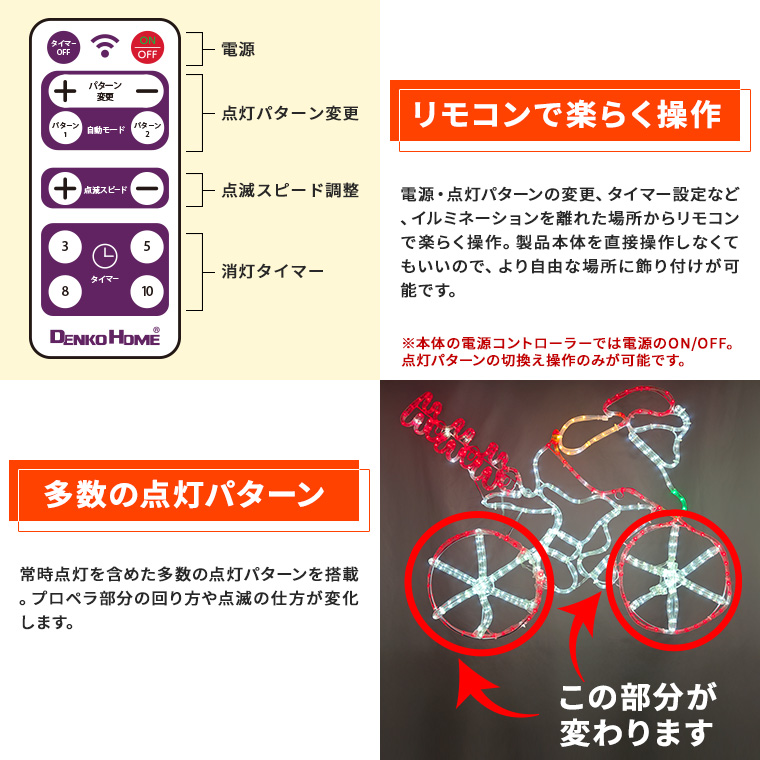 - リモコンで楽らく操作。電源・点灯パターンの変更、タイマー設定など、イルミネーションを離れた場所からリモコンで楽らく操作。製品本体を直接操作しなくてもいいので、より自由な場所に飾り付けが可能です。※本体の電源コントローラーでは電源のON/OFF。点灯パターンの切換え操作のみが可能です。