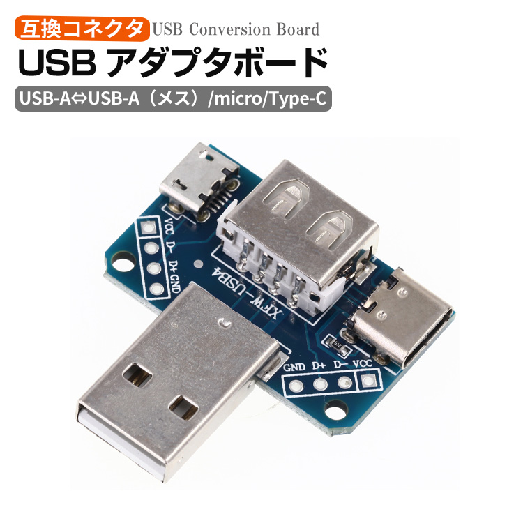 | 特徴 | 各種USB端子を1枚の基板で相互変換可能。配線実験・プロトタイプ作成・電子工作に最適。 |