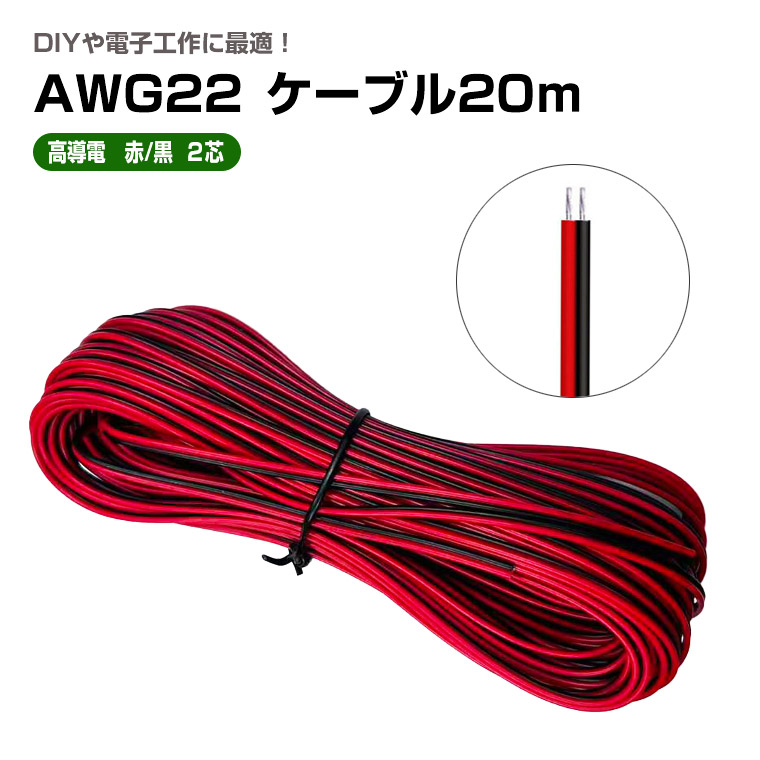 電子工作用 ケーブル 2芯 AWG22 20m 電線 コード はんだ付け 配線に最適 延長ケーブル LEDテープライト モジュール