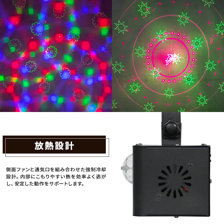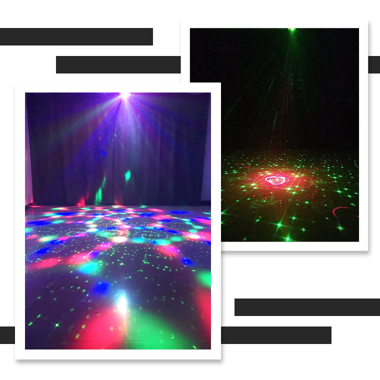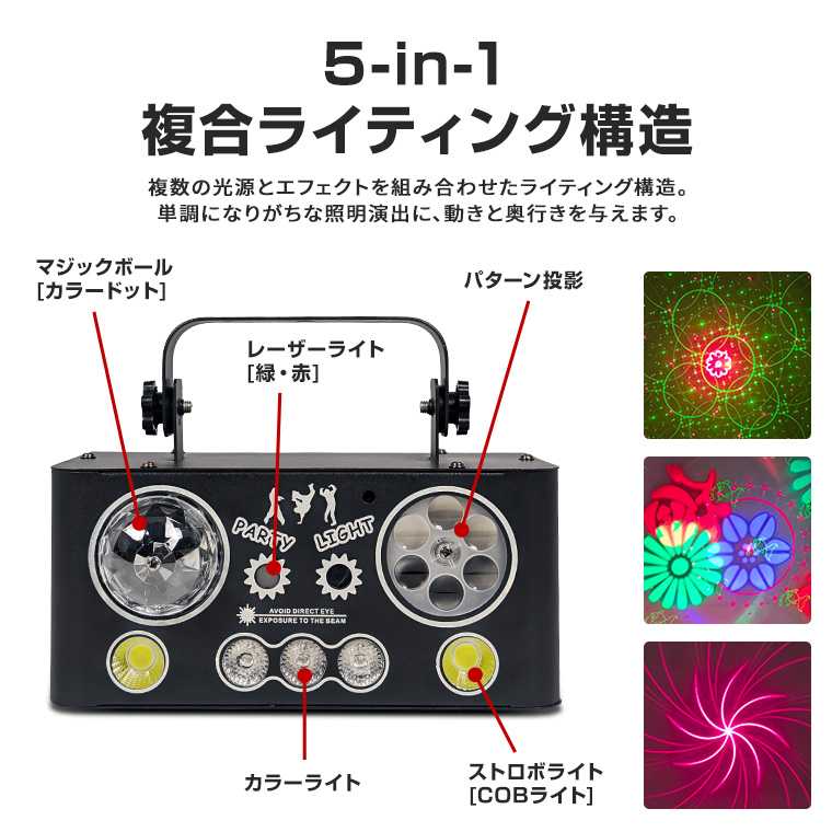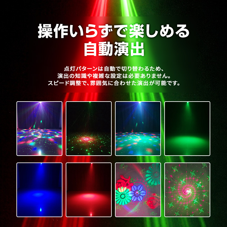 エフェクトライト マジックボール DMX対応 複合ライティング 音感対応 自動演出 リモコン付き スピード調整 レーザー 赤 緑 コンセント式 室内用 ステージライト ストロボ パーティーライト イベント 照明 LED 舞台照明 クラブ照明 電光ホーム