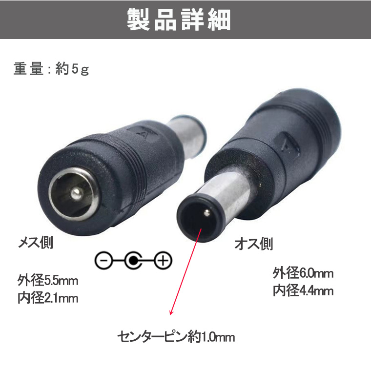 DC電源変換プラグ 5.5×2.1mm(メス)→ 6.0×4.4mm(オス)センターピン付き 約0.9mm 変換アダプター 変換コネクタ DCプラグ DCジャック