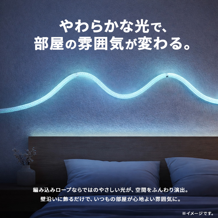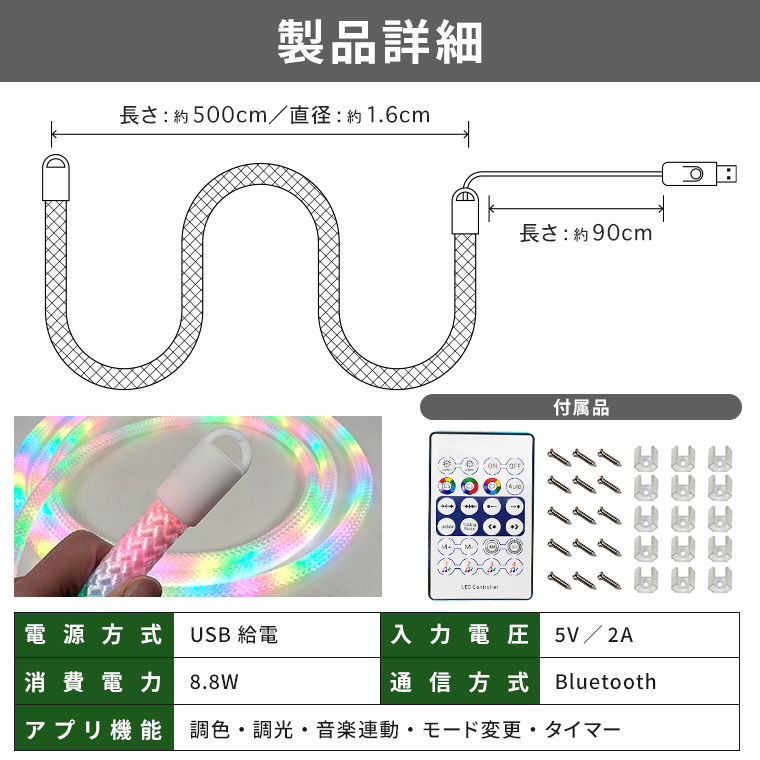 LEDネオンロープライト 5m 間接照明 編み込みロープ Bluetooth アプリ操作 音楽連動 USB電源 調光 調色 タイマー おしゃれ 電光ホーム