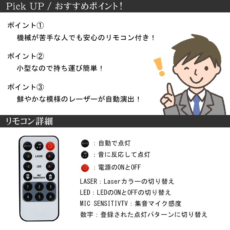 - 暗い部屋で投影、点滅させて長時間見続けると気分が悪くなる恐れがあります。レーザーは非常に強い光りですので、ご使用には十分に注意ください。 *当商品のレーザーのレベルは(ClassIIIA)です。目に損傷を与える危険性もあるので、レーザーの光を絶対直視しないでください。またレーザー光線を直接人や動物に照射することは絶対しないようにご注意の上ご利用下さい。家庭で使う時は、お子様の手の届かない場所に置いて保管ください。万が一、目に入ってしまい違和感がある場合は、医師に相談の上診察することをお勧めいたします。その場合、弊社は一切責任を負いかねますので、予めご了承ください。