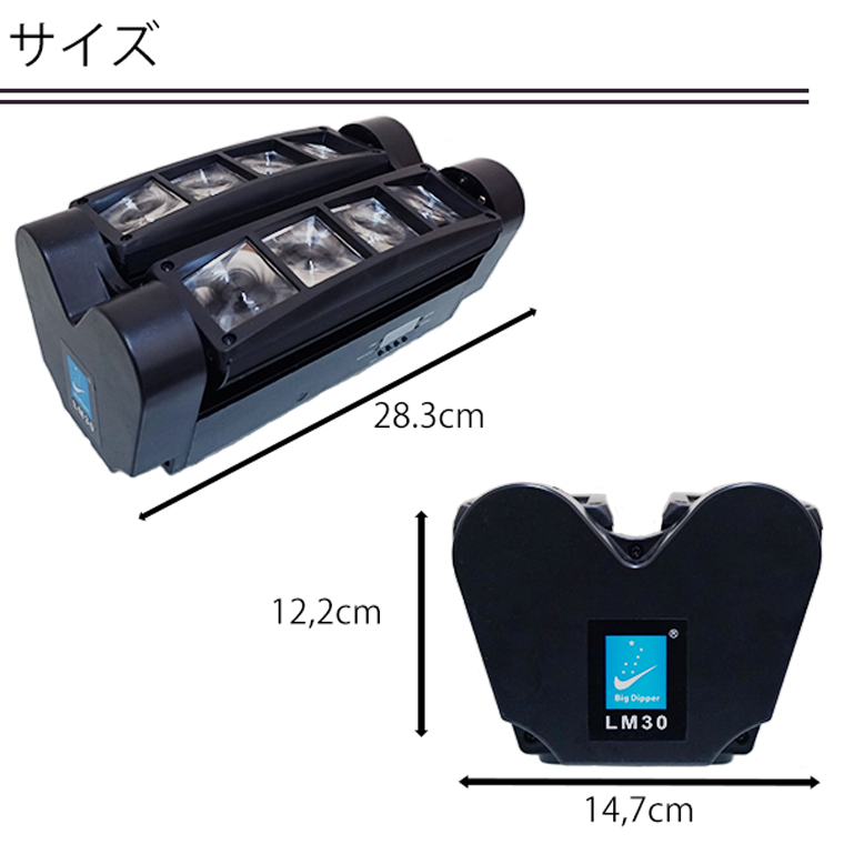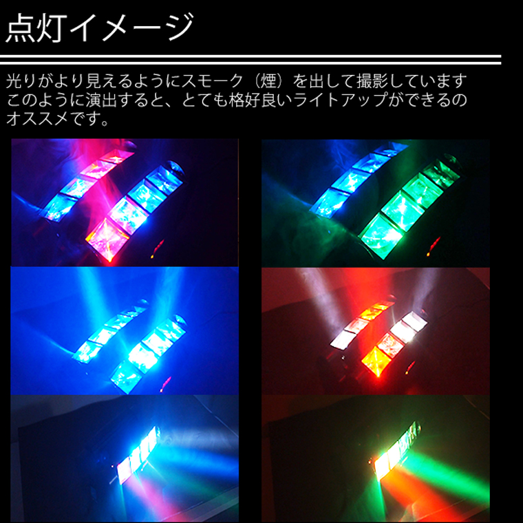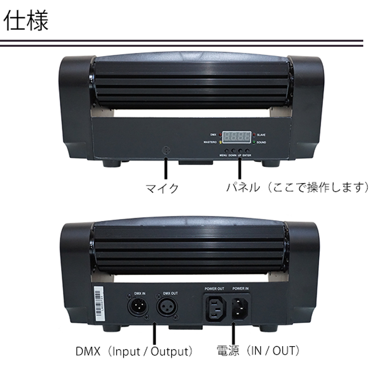 | 搭載モード | オートモード、サウンドモード、DMX、Master / Slave |