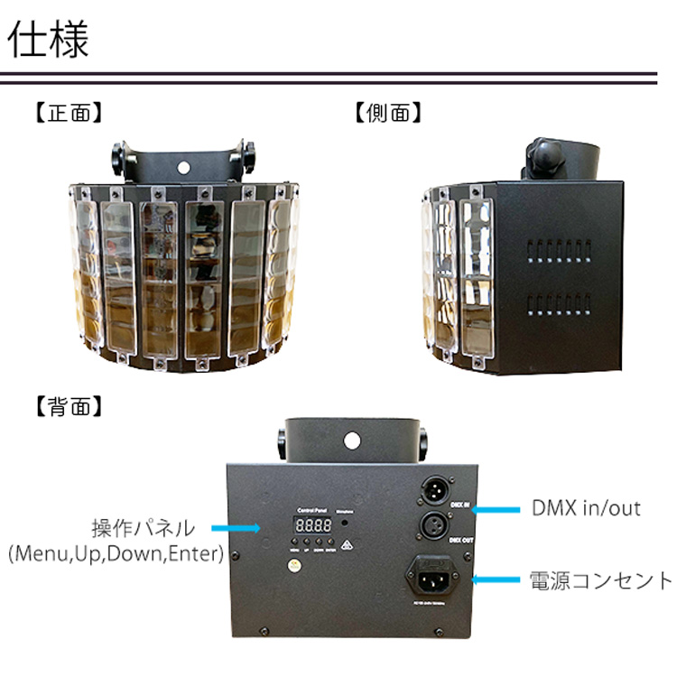 | 機能 | 自動点灯、サウンドモード、DMX |