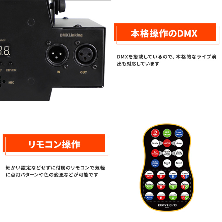 - 本格操作のDMX 。DMXを搭載しているので、本格的なライブ演出も対応しています