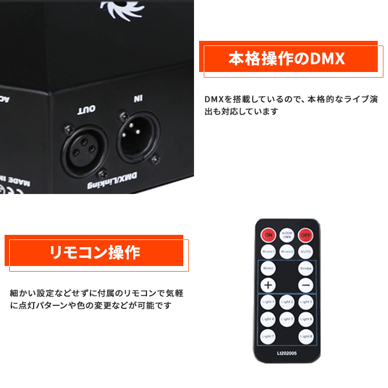 - 本格操作のDMX 。DMXを搭載しているので、本格的なライブ演出も対応しています