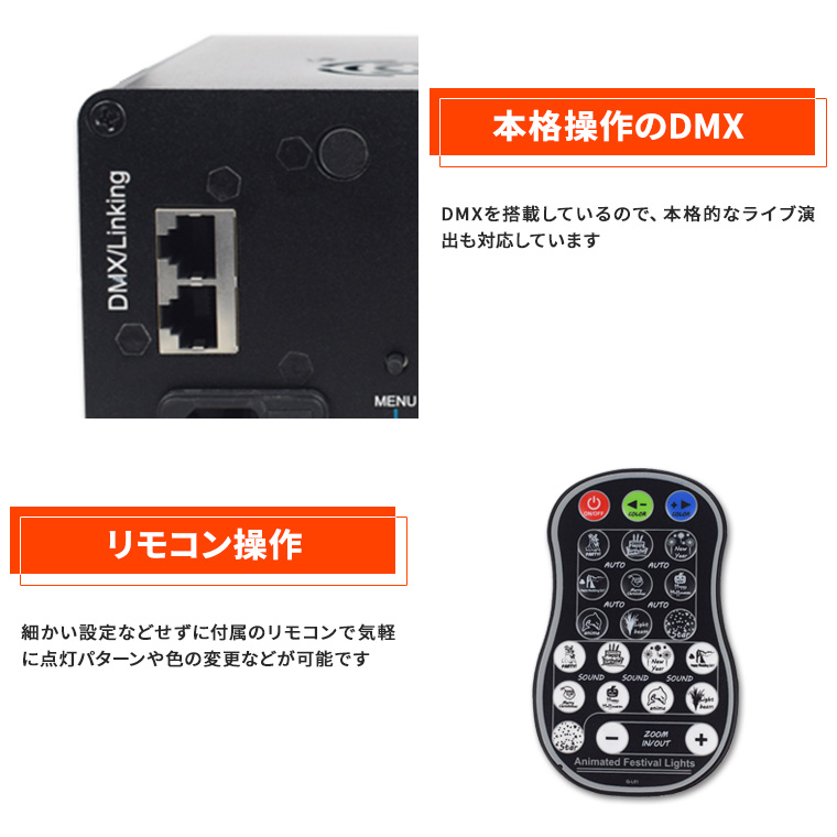 - 本格操作のDMX 。DMXを搭載しているので、本格的なライブ演出も対応しています