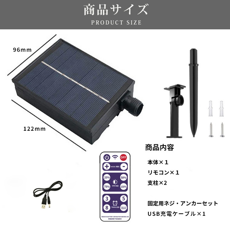 | 商品内容 | ソーラーパネルコントローラー本体×1、支柱×2、リモコン×1、USB充電ケーブル×1(充電アダプターと専用接続コネクター 別売り) |