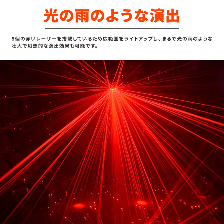 - 8個の赤いレーザー照射で広範囲をライトアップし、まるで光の雨のような壮大で幻想的な演出効果があります。