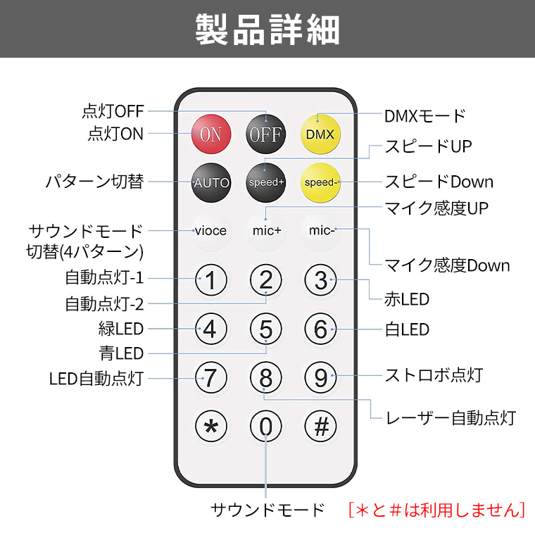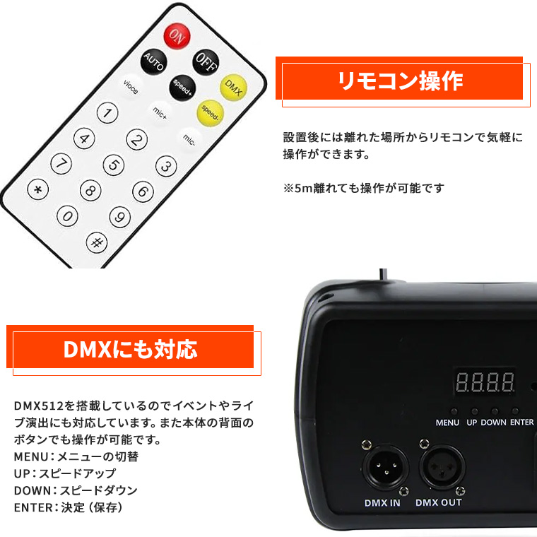 - DMXにも対応。DMXを搭載しているのでライブ演出も対応しています。 また本体の背面のボタンでも操作が可能です。