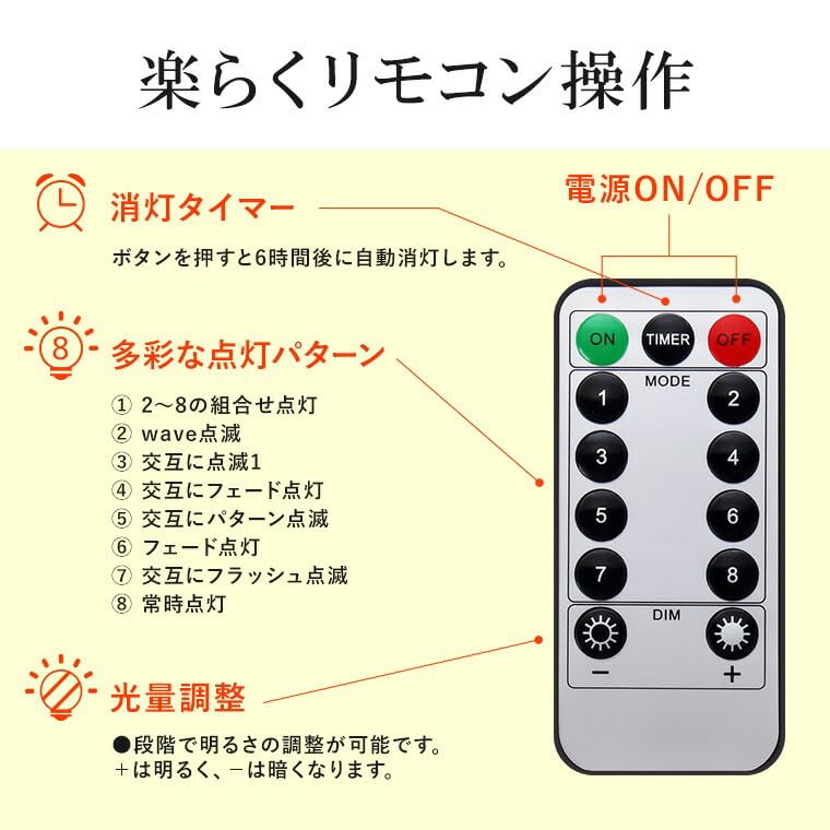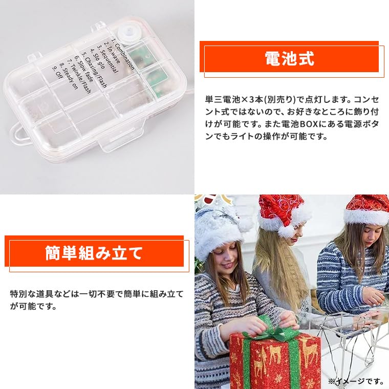 - 電池式。単三電池×3本(別売り)で点灯します。コンセント式ではないので、お好きなところに飾り付けが可能です。また電池BOXにある電源ボタンでもライトの操作が可能です。