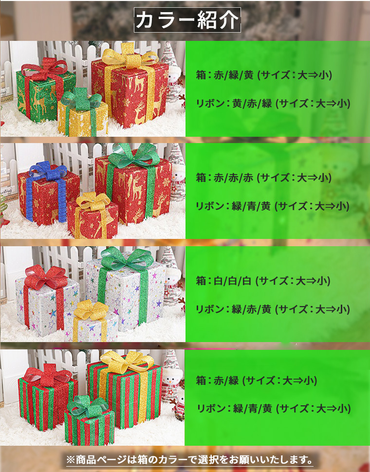 | 本体カラー | 箱:赤緑黄+リボン:黄赤緑 / 箱:赤赤赤+リボン:緑青黄 / 箱:白白白+リボン:緑赤黄 /箱:赤緑+リボン:黄赤緑 |