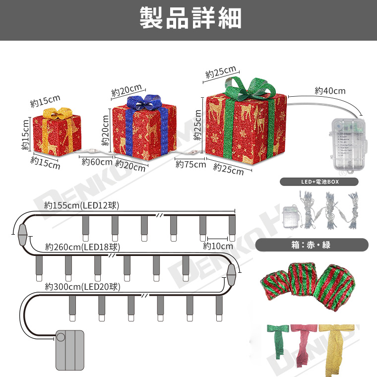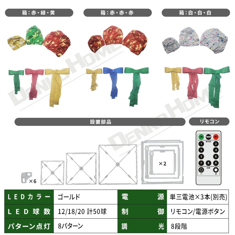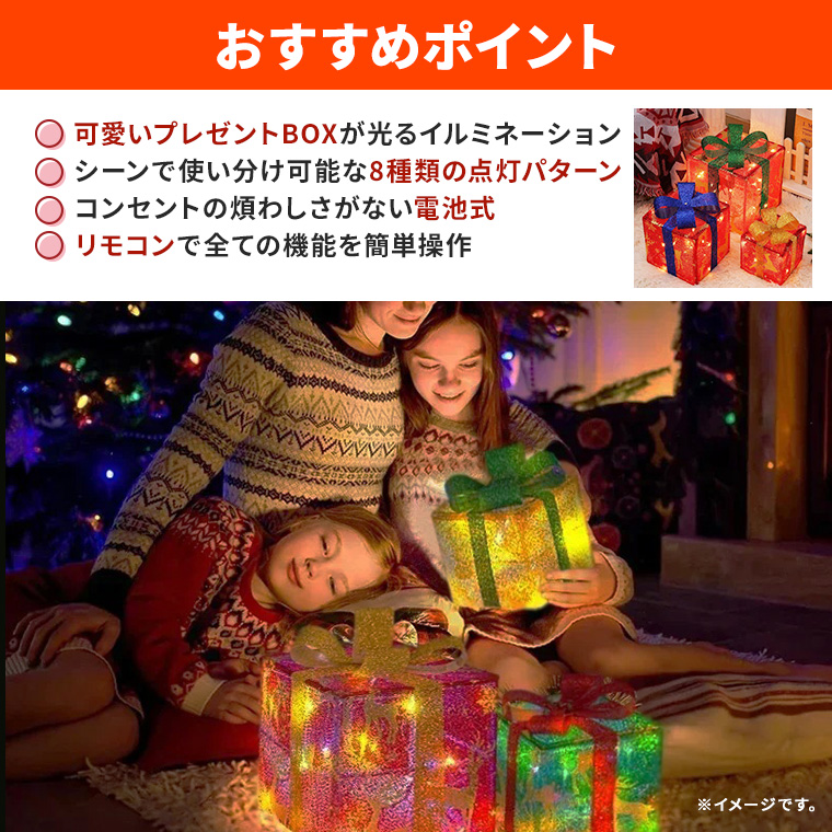 イルミネーション プレゼント ボックス LED BOX クリスマス リボン プレゼントボックス ギフト 贈り物 飾りライト 3連 イルミネーションライト リモコン付 調光 パターン点灯 タイマー 電池式 電飾 派手 飾り付け 装飾 モチーフ パーティー 誕生日 かわいい おしゃれ