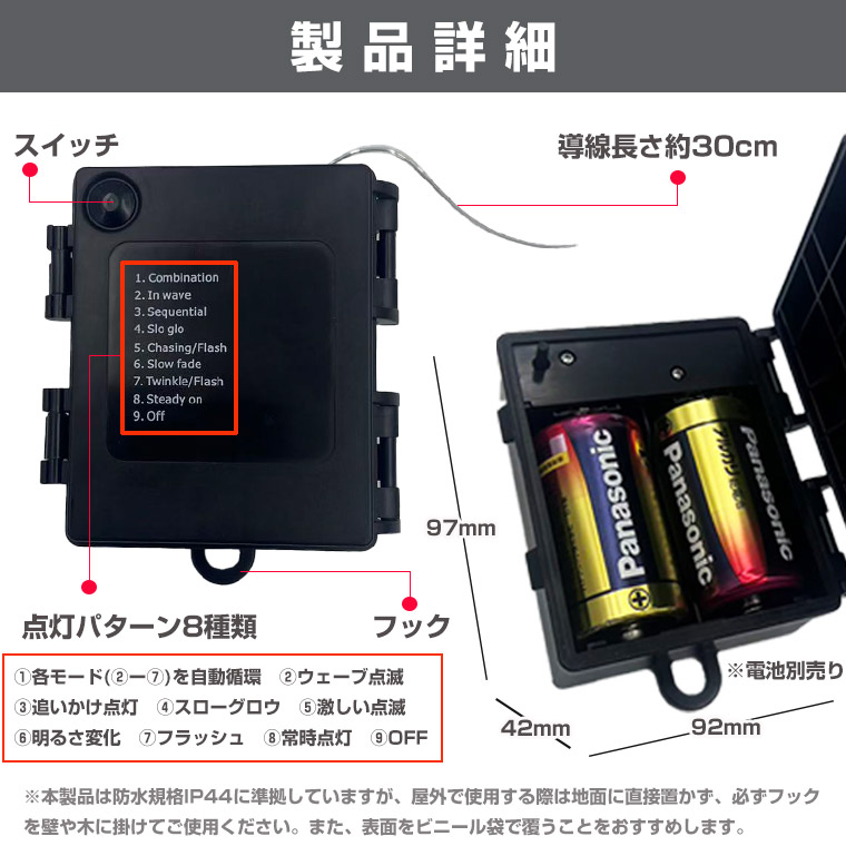- 【防水IP44】雨や水しぶきに強く、屋外イルミネーションやガーデンライトに安心して使用可能。