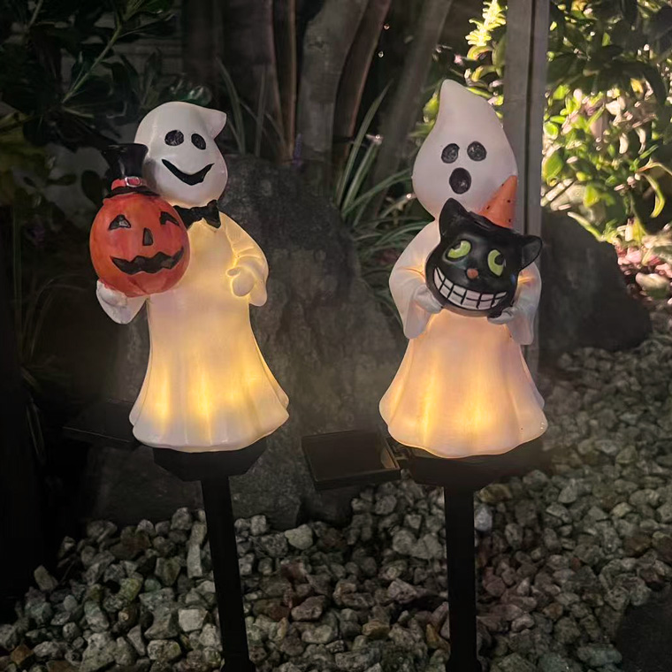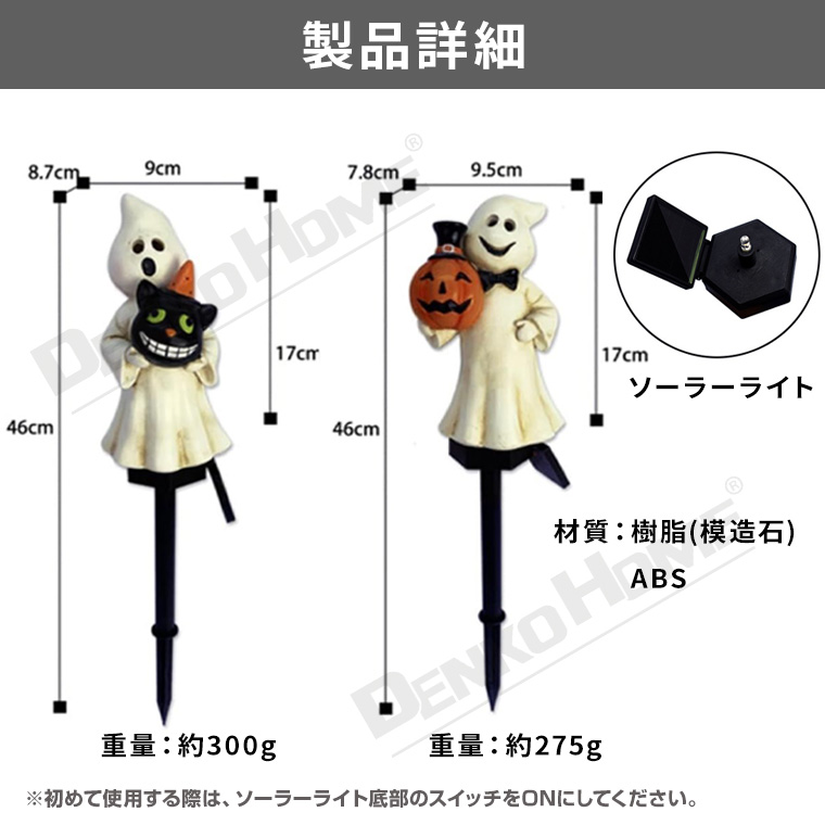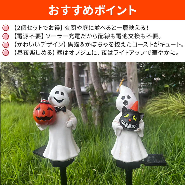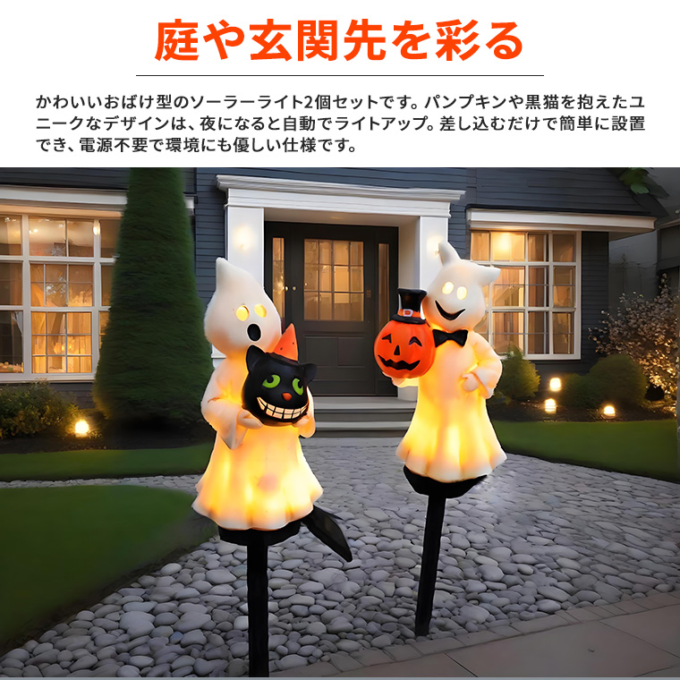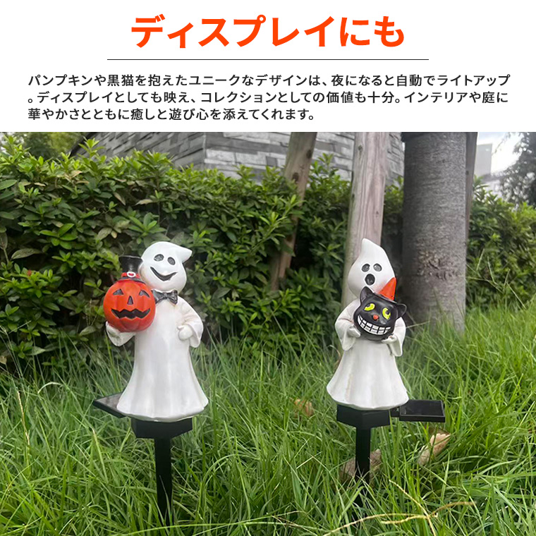 ソーラーライト ハロウィン 電飾 ゴースト 2個セット かぼちゃ 黒猫 お化け 庭飾り 差し込み式 かわいい ガーデン オーナメント オブジェ 置物 イルミネーションライト カボチャ 南瓜 モチーフ 玄関 庭 防水 門灯 外灯 庭園灯 充電式