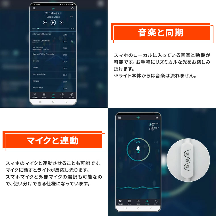 - 音楽と同期。スマホのローカルに入っている音楽と動機が可能です。お手軽にリズミカルな光をお楽しみ頂けます。※ライト本体からは音楽は流れません。