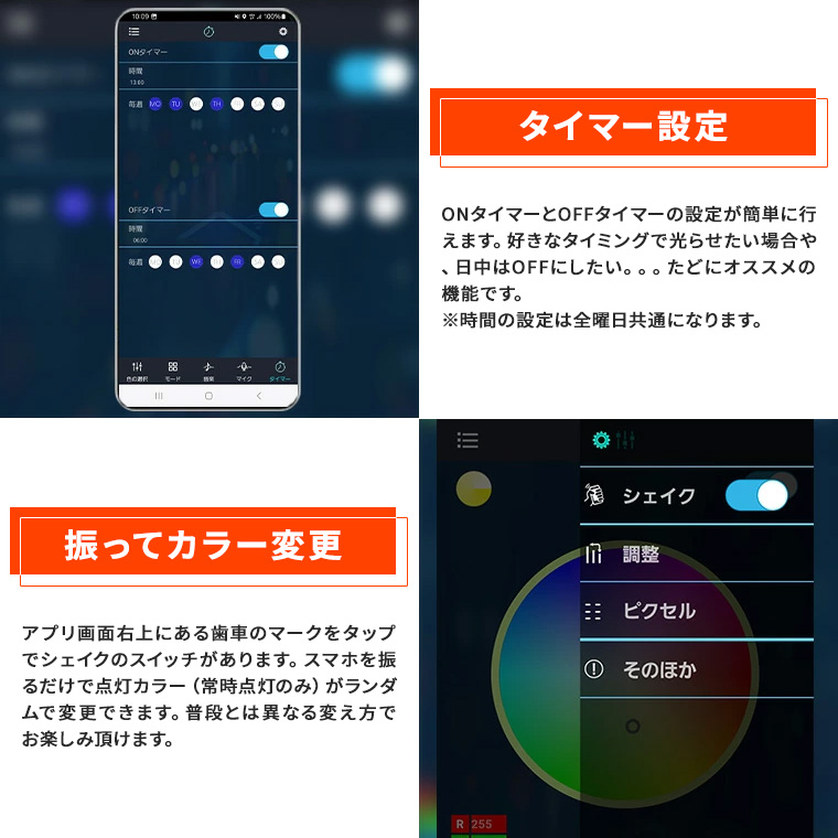 - 振ってカラー変更。アプリ画面右上にある歯車のマークをタップでシェイクのスイッチがあります。スマホを振るだけで点灯カラー(常時点灯のみ)がランダムで変更できます。普段とは異なる変え方でお楽しみ頂けます。