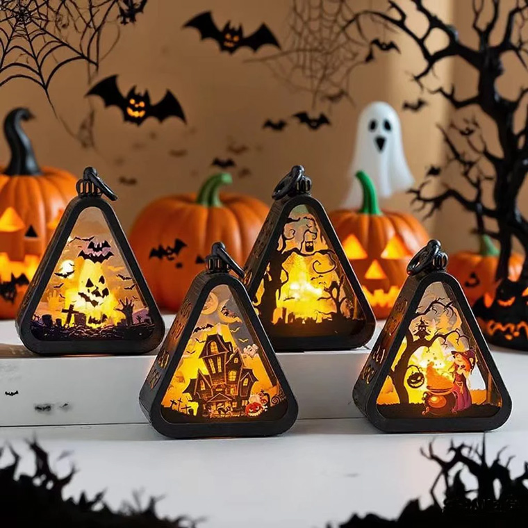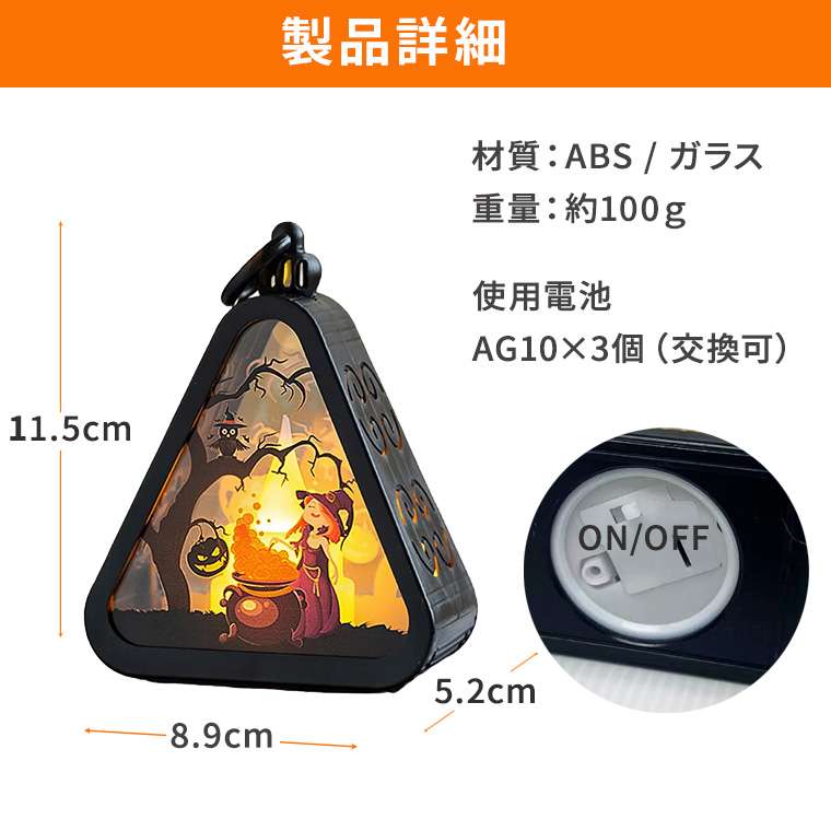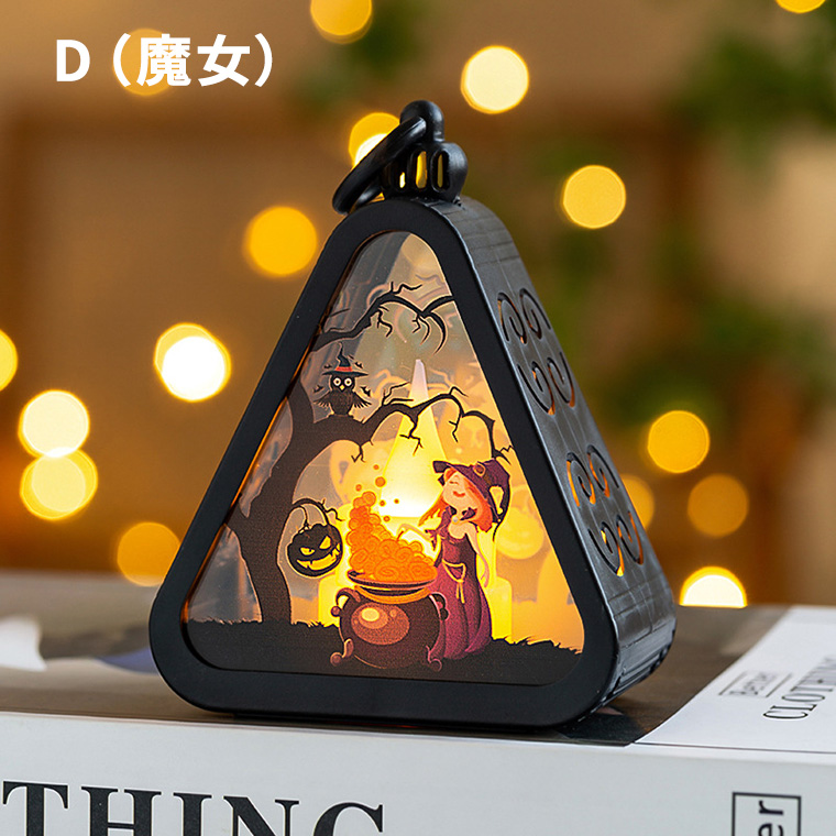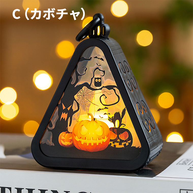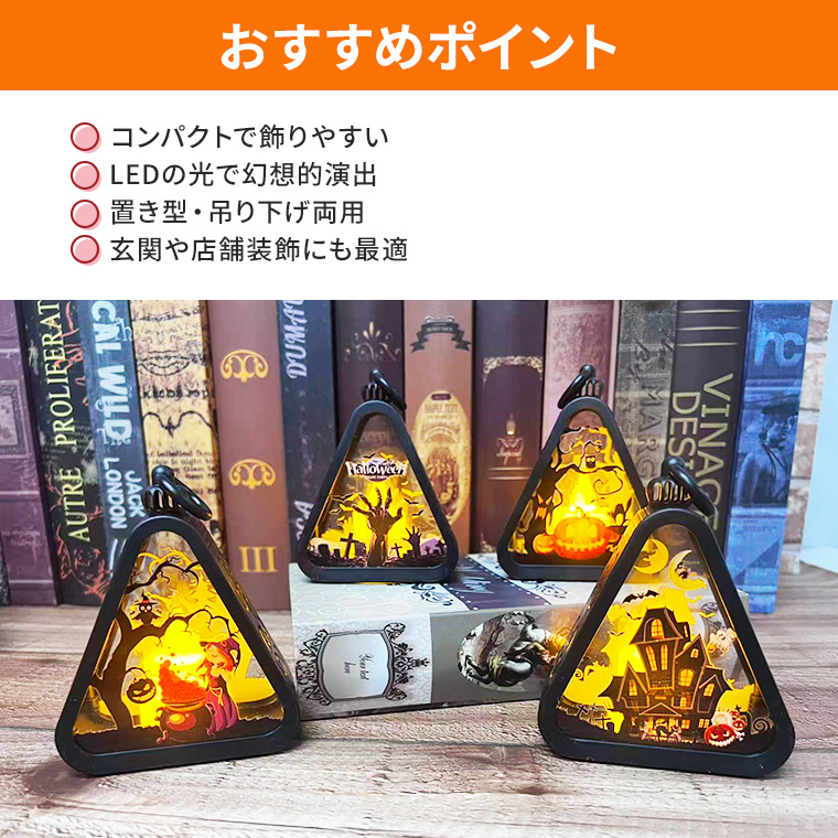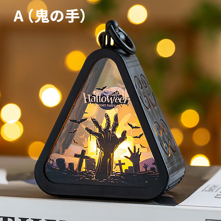 ハロウィン ランタン LEDライト 三角形 4種類 ハロウィン飾り 電飾 電池式 おしゃれ インテリア 置物 飾り 置き型 吊り下げ オブジェ ゴースト 黒猫 カボチャ パンプキン 魔女 死神 デコレーション