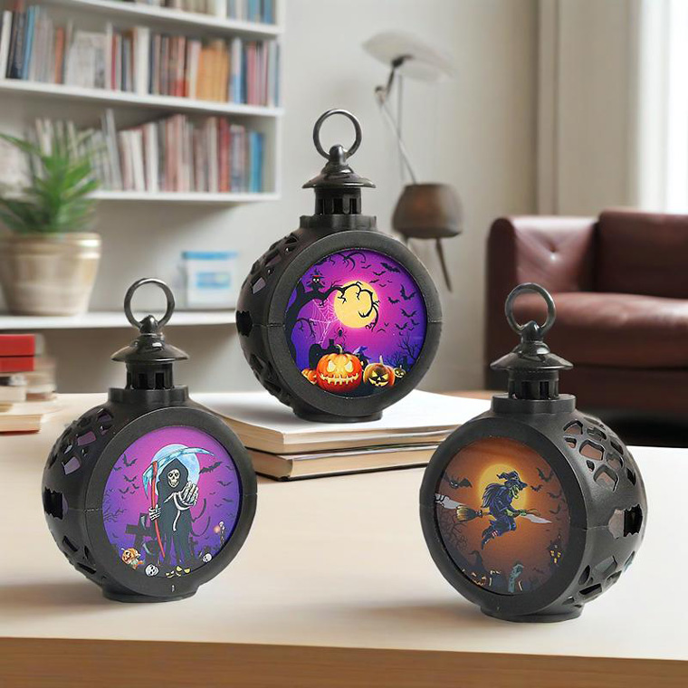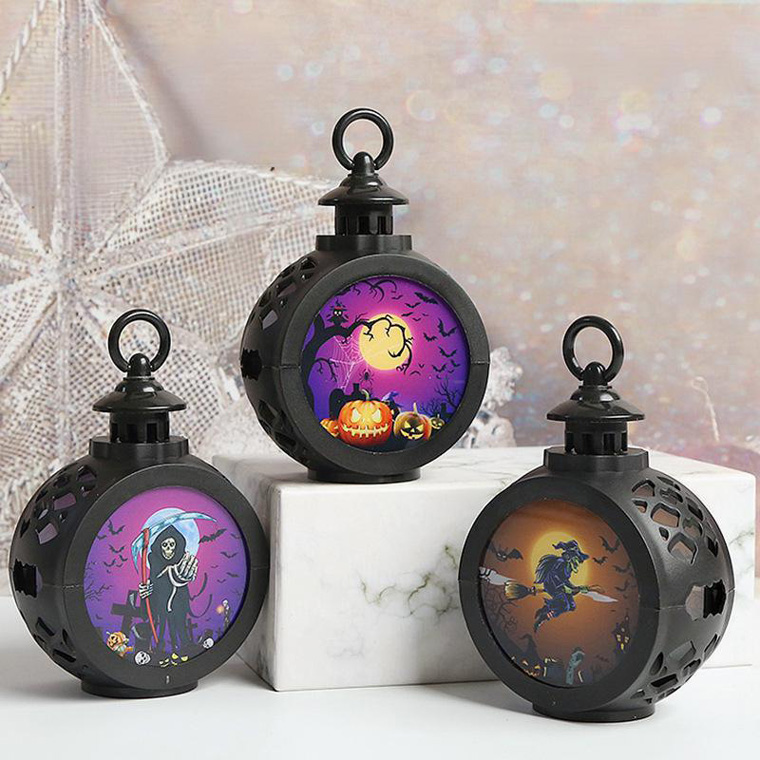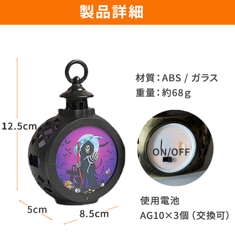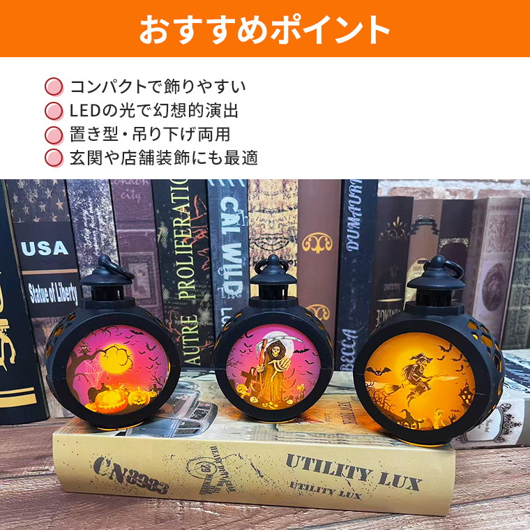 死神・カボチャ・魔女の3種類のデザインで、灯りをつけると温かみのあるオレンジ光が広がり、幻想的なムードを演出します。
