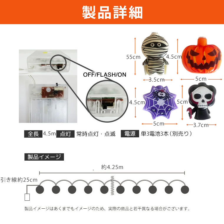 ソケット | 4種類のモチーフ(パンプキン・死神・クモの巣・ミイラ)は均等に配分されていますが、順番については生産上の都合によりばらつきがございます。ご了承ください。 |