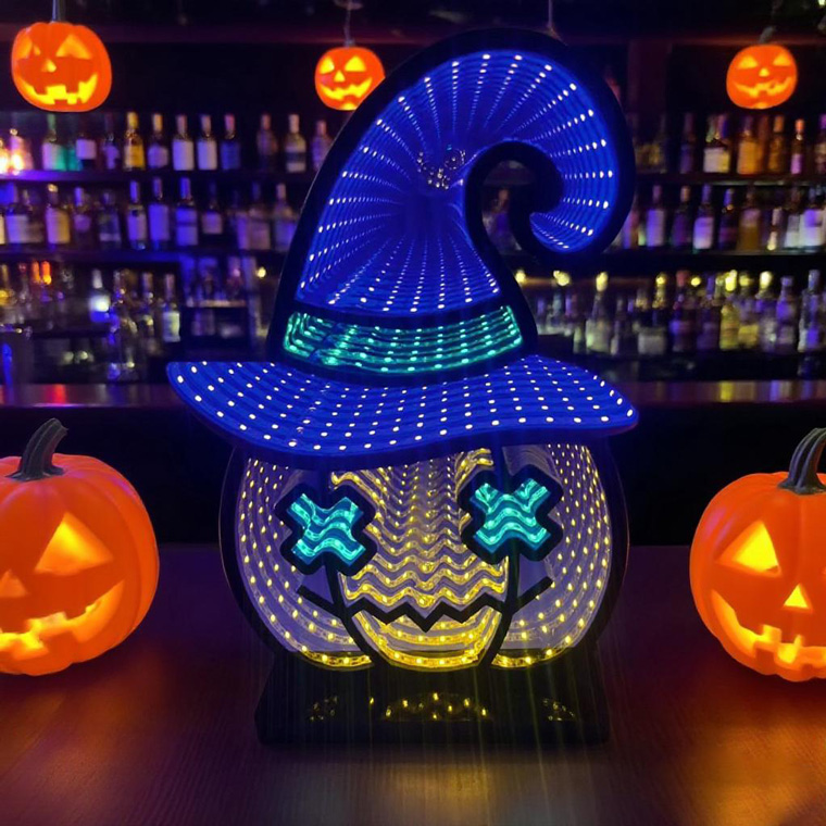 魔女帽子をかぶった星目かぼちゃのデザインが光り輝き、まるで奥行きが無限に続くような幻想的な光のトンネル効果を楽しめます。