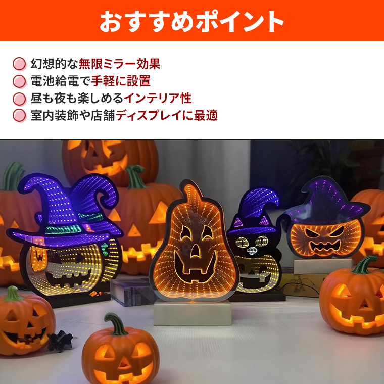 ハロウィン LED 無限 ミラーライト (インフィニティミラーランプ) カボチャ トンネルランプ 電池式 ハロウィン ライト ハロウィン飾り 電飾 インテリア サイン 看板 オブジェ 黒猫 カボチャ パンプキン 魔女