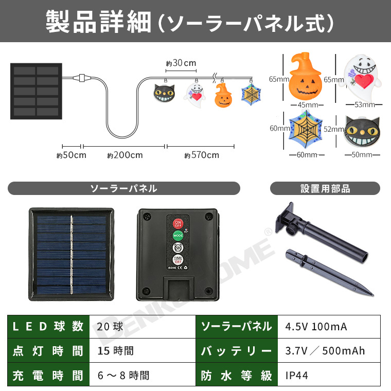 パンプキンやゴースト、黒猫、星形などユニークなモチーフが20球連なり、全長5.6mのボリューム感で一気に雰囲気を演出します。
