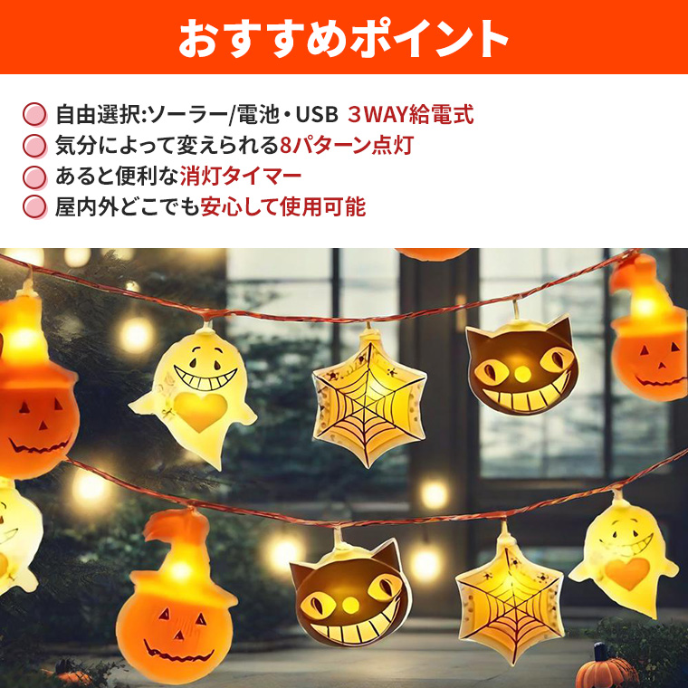 ハロウィン 電飾 飾り 20球 5.6m 3WAY給電 電池式 USB 式 ソーラー タイマー付 お化け 黒猫 クモ ガーランド ライト かぼちゃ パンプキン お化け 黒猫 クモ 電球色 室内用 ストレート イルミネーション 電球色 LED ハロウィン 飾り付け 装飾 部屋 玄関
