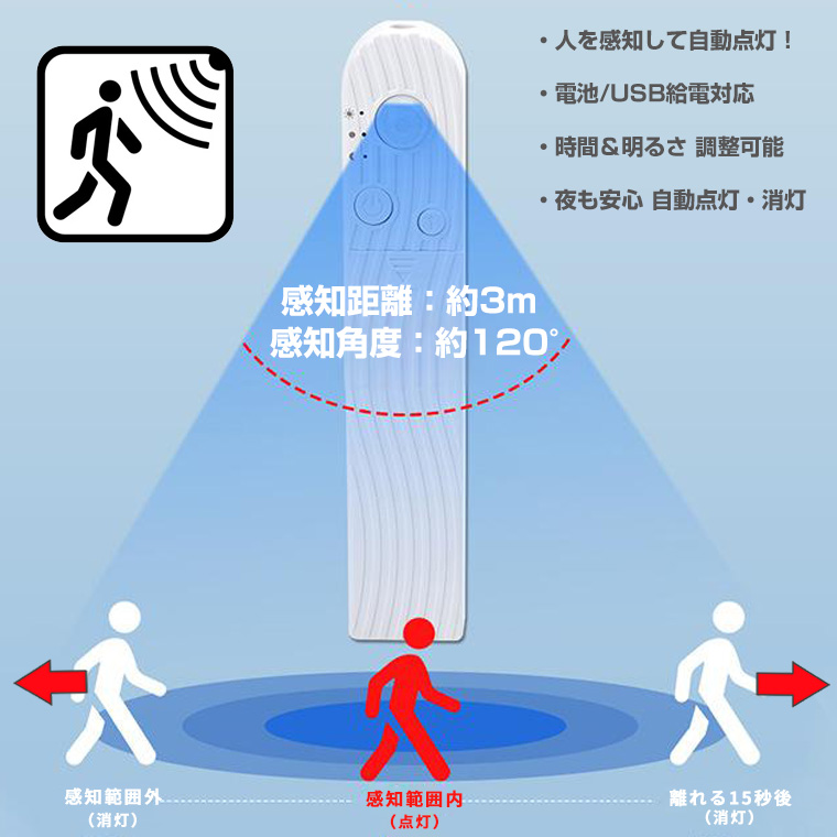 - 赤外線人感センサー搭載 、近づくと自動点灯
