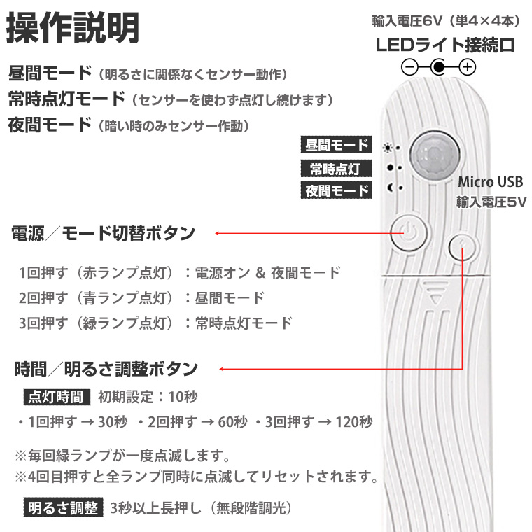 3つの点灯モード(夜間モード/昼間モード/常時点灯モード)を搭載し、点灯時間は10~120秒まで調整可能。さらに長押しで無段階調光も可能です。
