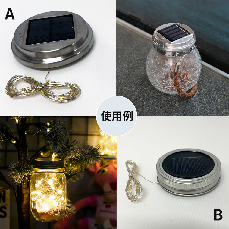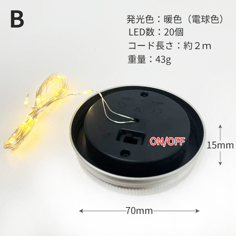 1.2V 600mAhの充電池を内蔵し、スイッチでON/OFF切り替え可能。蓋型タイプで、瓶・ランタン・プランターなどお好みの容器にセットするだけで簡単におしゃれ照明が作れます。