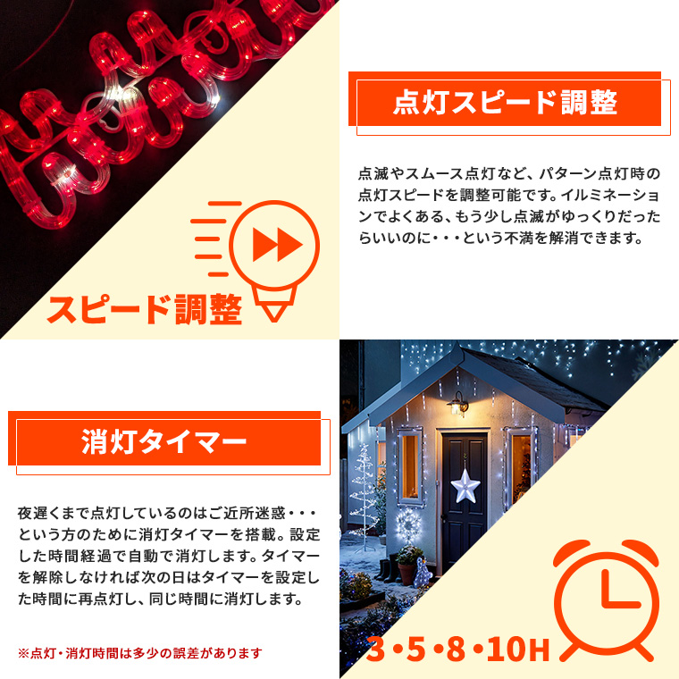 - 点灯スピード調整。点滅やスムース点灯など、パターン点灯時の点灯スピードを調整可能です。イルミネーションでよくある、もう少し点滅がゆっくりだったらいいのに・・・という不満を解消できます。