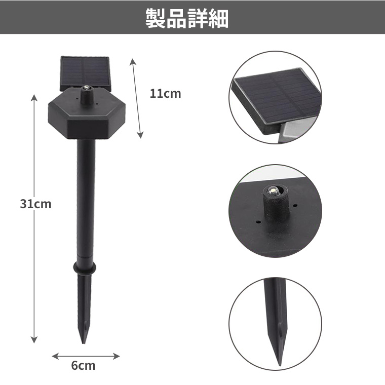 - 地面に挿すだけの簡単設置で、電源不要&防雨仕様!