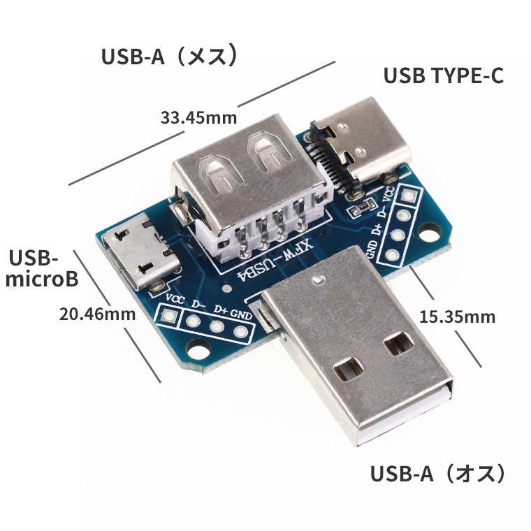 | 対応端子 | USB-A(メス)/USB-A(オス)/Micro USB/Type-C ピッチ:2.54mm/4Pin |