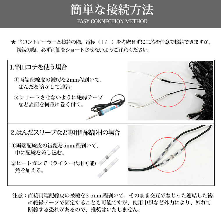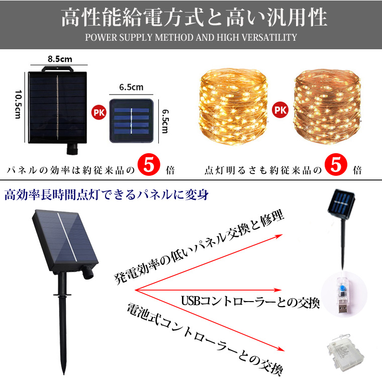 LED100球程度のものであれば、数日間曇りの日にも、朝まで点灯も実現可能です。接続方法簡単、通常電極(+/-)を考慮せずに二芯を任意で接続できます。本体操作だけでなく、リモコンからも、電源ON/OFF、点灯パターンの変更(常時点灯を含む8モード)や明るさ調整、消灯タイマー設定を離れた場所(最大5m)から楽々操作することができます。