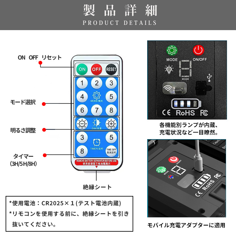 ![DIY LEDイルミネーション用 コントローラー リモコン付き 8モード タイマー付き USB充電式 3.7V出力 Type-C対応 電飾・ガーデンライト・DIY照明に]()