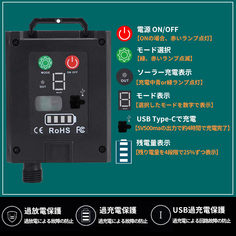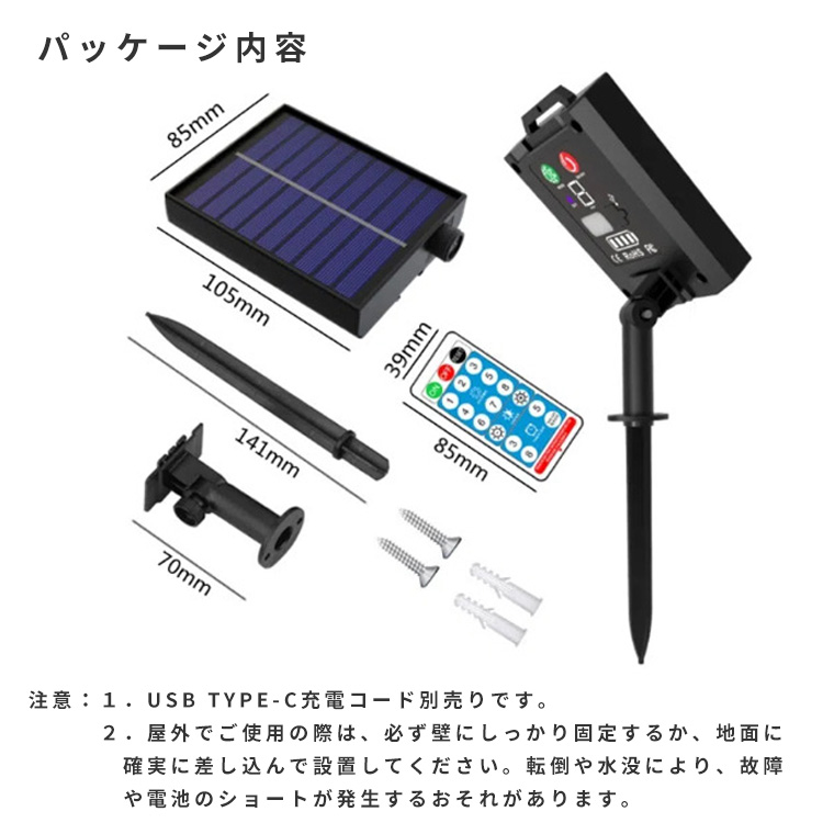 | パッケージ内容 | ソーラーパネルコントローラー本体×1、支柱×2、リモコン×1 ※USB充電ケーブル・充電アダプター別売り) |