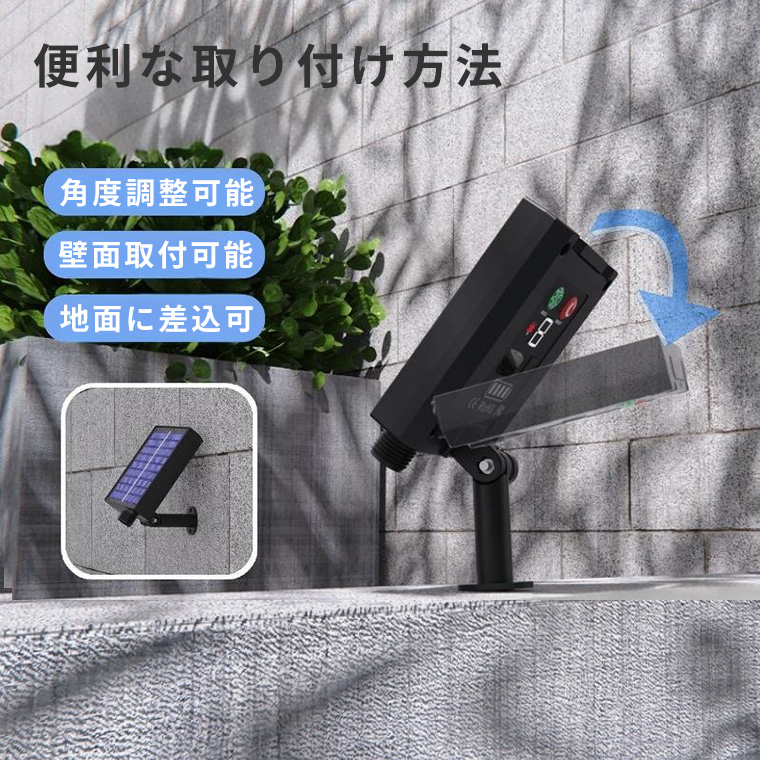 | 注意 | 1.出力電圧5V以上または交流電圧100V使用する電飾には対応しません。ご購入前に、電圧、コネクタの口径などのサイズをご確認ください。 2.ご使用の際は、あらかじめスイッチを「ON」にして、日光の下で充電を行ってください。 3.屋外でご使用の際は、必ず壁にしっかり固定するか、地面に確実に差し込んで設置してください。 転倒や水没により、故障や電池のショートが発生するおそれがあります。 |