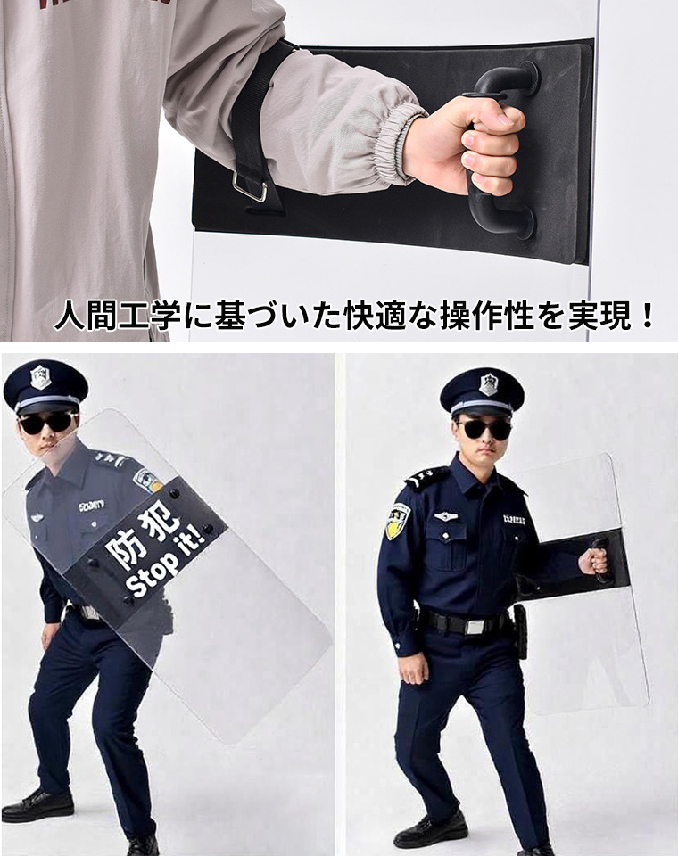 厚さ3cmの頑丈設計で、破損や変形に強く、警備・防犯・訓練など幅広いシーンで活躍します。 裏面には滑りにくい取手と手首固定バンドを装備。しっかりと握ることができ、安定した防御姿勢を保てます。