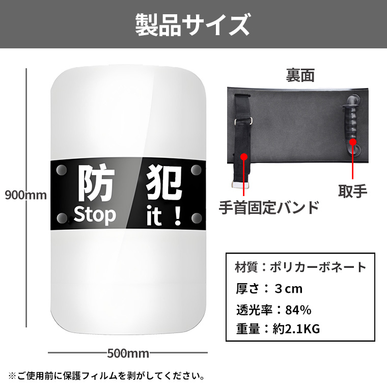 - 【高強度ポリカーボネート製】耐衝撃性に優れた透明防護盾。