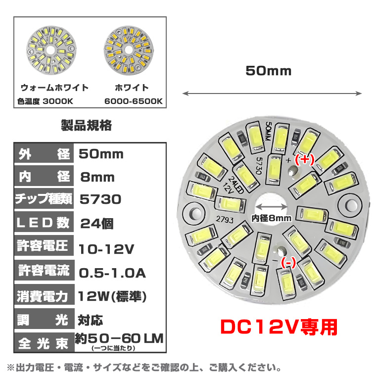 12V LEDモジュール 24灯 12W 丸型 50mm SMD5730 ホワイト/ウォームホワイト 調光対応 DC12V専用 DIY 照明用ユニット LEDチップ 照明 円形 光る台座 用 汎用 LED基盤 LEDアレイ