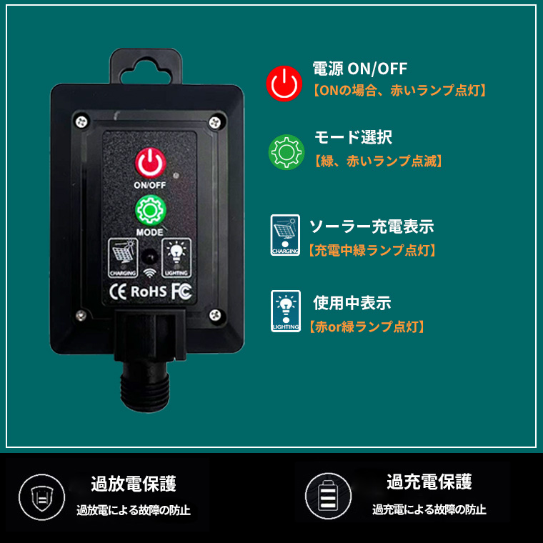 本体内部電池の保護機能を搭載しており、安全性が高く安心してお使いいただけます。屋外でご使用の際は、壁にしっかり固定するか、地面に確実に差し込んで設置することで、より安全かつ効率的に長くご使用いただけます。