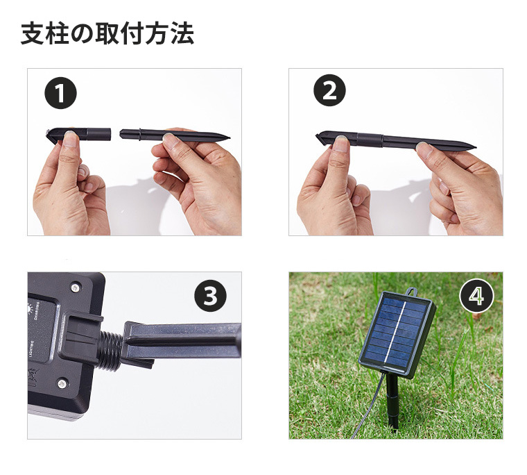 | 注意 | 1.出力電圧5V以上または交流電圧100V使用する電飾には対応しません。ご購入前に、電圧、コネクタの口径などのサイズをご確認ください。 2.ご使用の際は、あらかじめスイッチを「ON」にして、日光の下で充電を行ってください。 3.屋外でご使用の際は、必ず壁にしっかり固定するか、地面に確実に差し込んで設置してください。 転倒や水没により、故障や電池のショートが発生するおそれがあります。 |